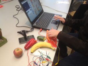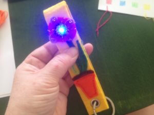 Vi leger med elektronik i papir, tøj og genbrug efter principperne i bogen “Sæt strøm til de kreative fag”. Vi laver kort og billeder til jul/valentin/fødselsdag, der lyser, vibrerer og måske laver lyde… Vi sætter elektronik i tekstiler, så der kommer lys i tasken, slipset, bæltet…. Vi leger med elektronik i seje smykker og accessories til både store og små.. Vi leger med lys i glas og akryl og laver sjove, finurlige, seje lamper… Vi leger med små robotter til børn og microcontrollere til de ældre…. Vi kigger på apps og kodelege til de mindste….