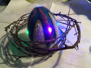 Vi nålefilter æg, julekugler, hjerter eller måske en fisk med et farvemønster og lægger en stump LED kæde ind i filten.